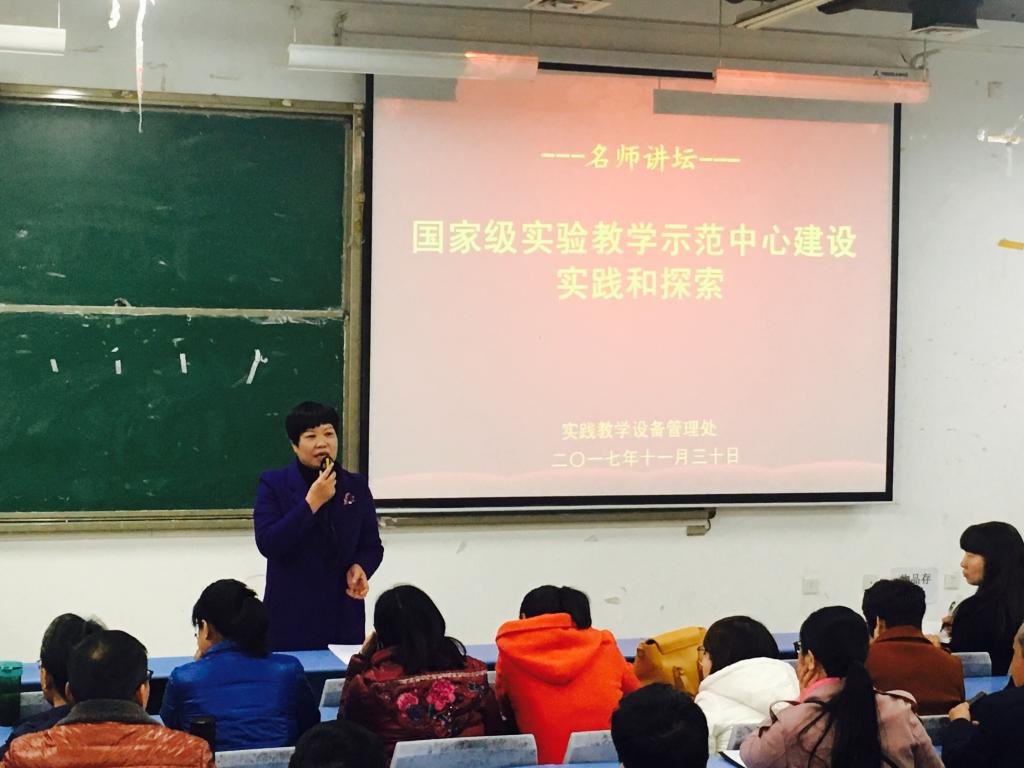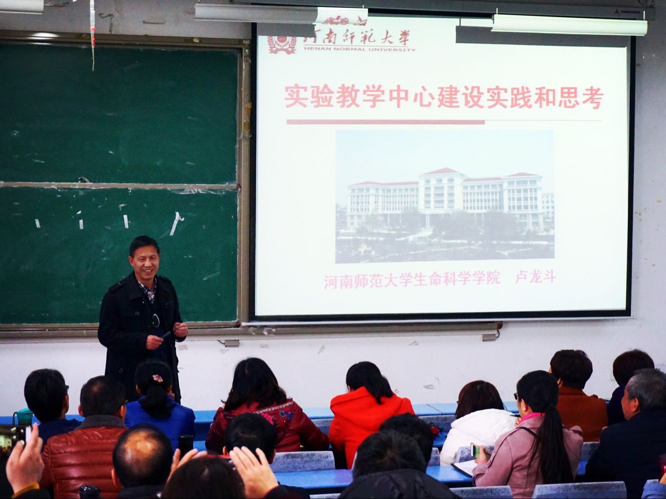 11月30日下午,实践教学设备管理处在1号教学楼201教室举办“名师讲坛”活动。活动由实践教学设备管理处处长赵敏主持,全校各院系分管实验室的副院长(副主任)、教科研秘书、教研室主任、实验员、学生兼职实验员等相关师生一百余人参加了此次活动。这次“名师讲坛”的主讲嘉宾是河南师范大学原生命科学学院院长、国际木犀属品种登录委员会委员,中国遗传学会理事,河南省遗传学会副理事长,遗传学省级重点学科带头人,硕士生导师卢龙斗教授。卢教授为大家做了题为“国家级实验教学示范中心建设实践和探索”的报告。