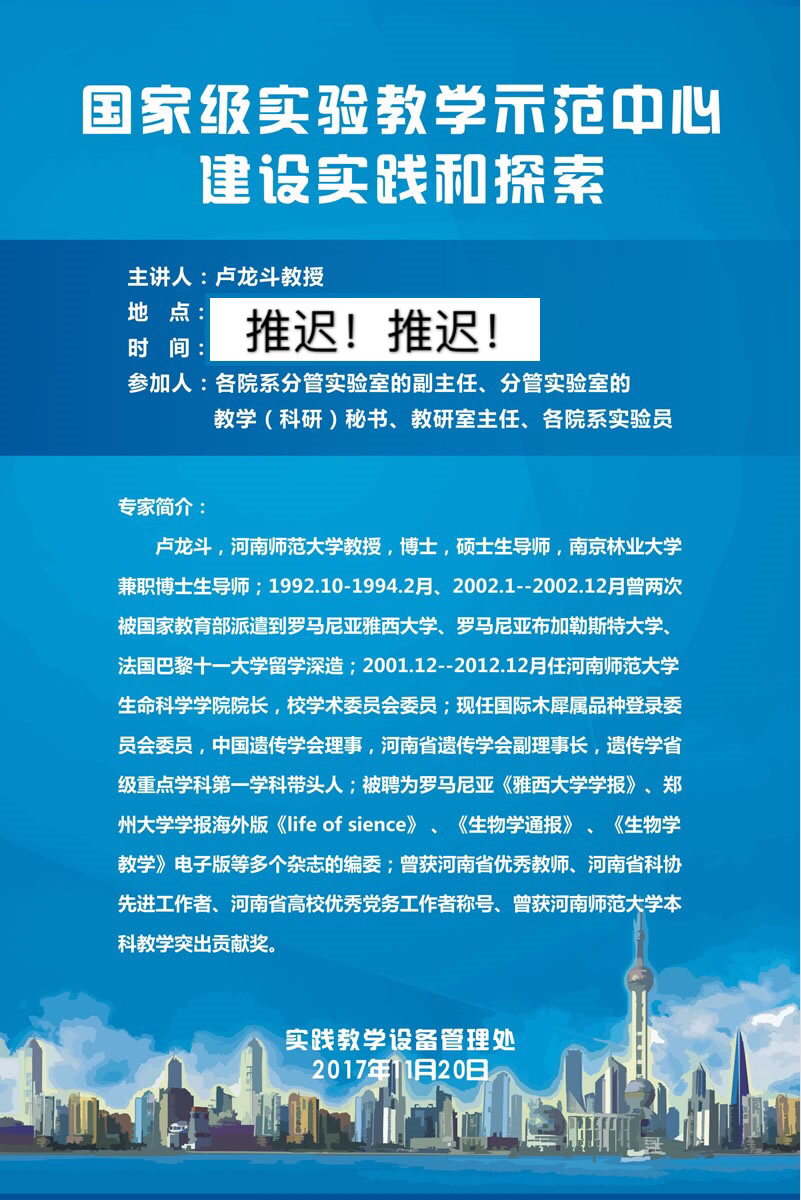 原定于本周四(11月23日)下午2点40在龙子湖校区1号教学楼201教室举办的“名师讲坛”活动,因故推迟到下周,具体时间另行通知!