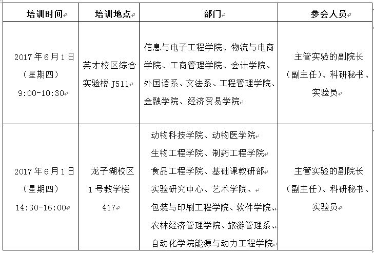根据河南省教育厅《关于进一步加强高校实验室安全建设的通知》(教高〔2016〕355号)和《河南省教育厅办公室关于对高校实验室进行安全检查的通知》(教高〔2017〕353号)文件的要求,“实验室安全考核”工作是学校实验室安全管理工作的一项重要内容,也是我省实验室安全检查的重点项目。目前,我校已将“实验室安全考核”列为学生安全教育的重点工作,并构建了“实验室安全考试系统”,该系统今后将对师生进入实验室进行准入考核。目前,对全校教学部门开展“实验室安全考试系统”的培训工作,请各部门高度重视,按要求参加培训。现将培训事宜通知如下: